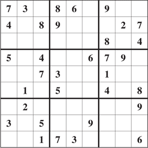 Sudoku is easy to play and the rules are simple. Fill in the blanks so that each row, each column, and each of the nine 3x3 grids contain one instance of each of the numbers 1 through 9.