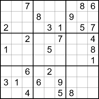 Sudoku is easy to play and the rules are simple. Fill in the blanks so that each row, each column, and each of the nine 3x3 grids contain one instance of each of the numbers 1 through 9.
