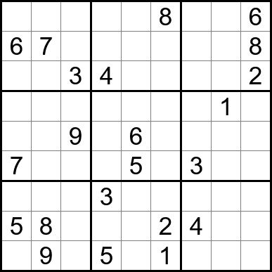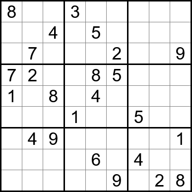 Sudoku is easy to play and the rules are simple. Fill in the blanks so that each row, each column, and each of the nine 3x3 grids contain one instance of each of the numbers 1 through 9.