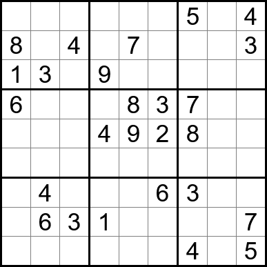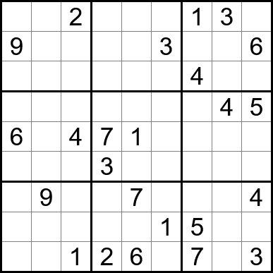 Sudoku is easy to play and the rules are simple. Fill in the blanks so that each row, each column, and each of the nine 3x3 grids contain one instance of each of the numbers 1 through 9.