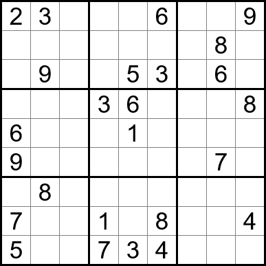 Sudoku is easy to play and the rules are simple. Fill in the blanks so that each row, each column, and each of the nine 3x3 grids contain one instance of each of the numbers 1 through 9.
