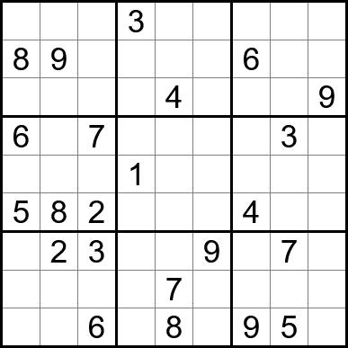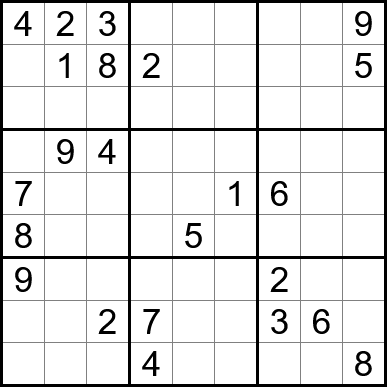 Sudoku is easy to play and the rules are simple. Fill in the blanks so that each row, each column, and each of the nine 3x3 grids contain one instance of each of the numbers 1 through 9.