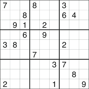 Sudoku is easy to play and the rules are simple. Fill in the blanks so that each row, each column, and each of the nine 3x3 grids contain one instance of each of the numbers 1 through 9.