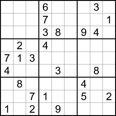 Sudoku is easy to play and the rules are simple. Fill in the blanks so that each row, each column, and each of the nine 3x3 grids contain one instance of each of the numbers 1 through 9.