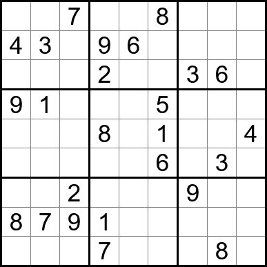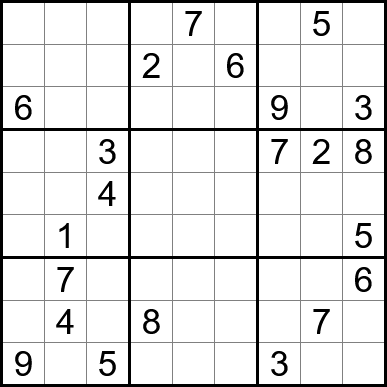 Sudoku is easy to play and the rules are simple. Fill in the blanks so that each row, each column, and each of the nine 3x3 grids contain one instance of each of the numbers 1 through 9.