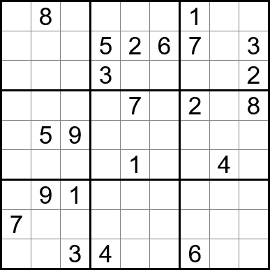 Sudoku is easy to play and the rules are simple. Fill in the blanks so that each row, each column, and each of the nine 3x3 grids contain one instance of each of the numbers 1 through 9.